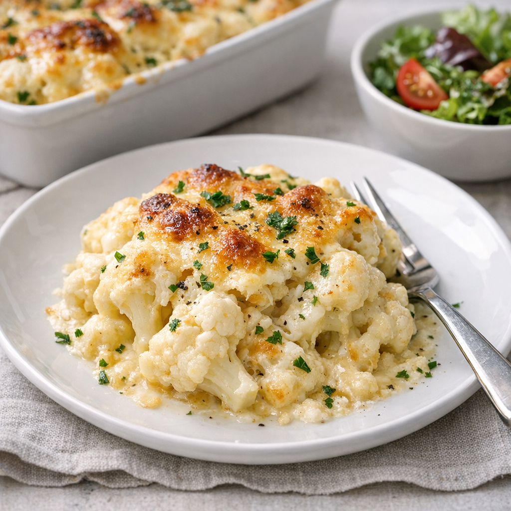 Klassisk, cremet blomkålsgratin med ostesauce og sprød gratinering. Perfekt som tilbehør eller let hovedret.