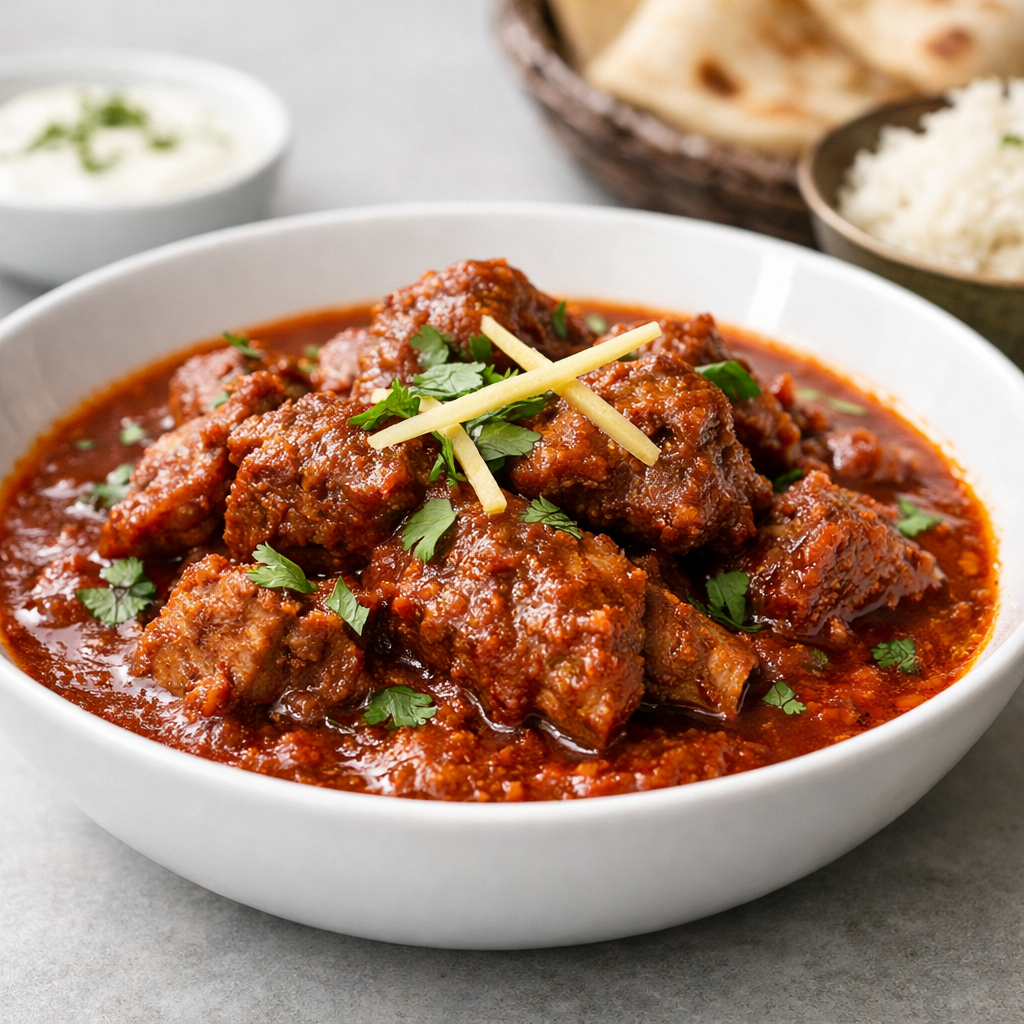 Rogan Josh er en klassisk, aromatisk indisk/kashmirisk karry med dyb rød farve fra krydderier og (evt.) mild chili/paprika. Denne version er lavet med mørt lam, yoghurt og varme krydderier og serveres perfekt med basmatiris eller naan.